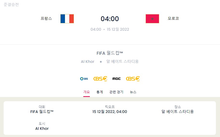 4강전 : 프랑스 vs. 모로코(12월 15일 04시)