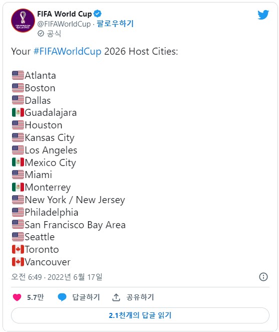 국제축구연맹(FIFA)가 지난 6월 17일(한국시각) 2026 북중미 월드컵 개최 도시를 확정한 후 공식 발표했습니다. 사상 최초로 3개국이 공동 개최하는 2026년 대회는 미국, 캐나다, 멕시코의 16개 도시에서 열립니다.