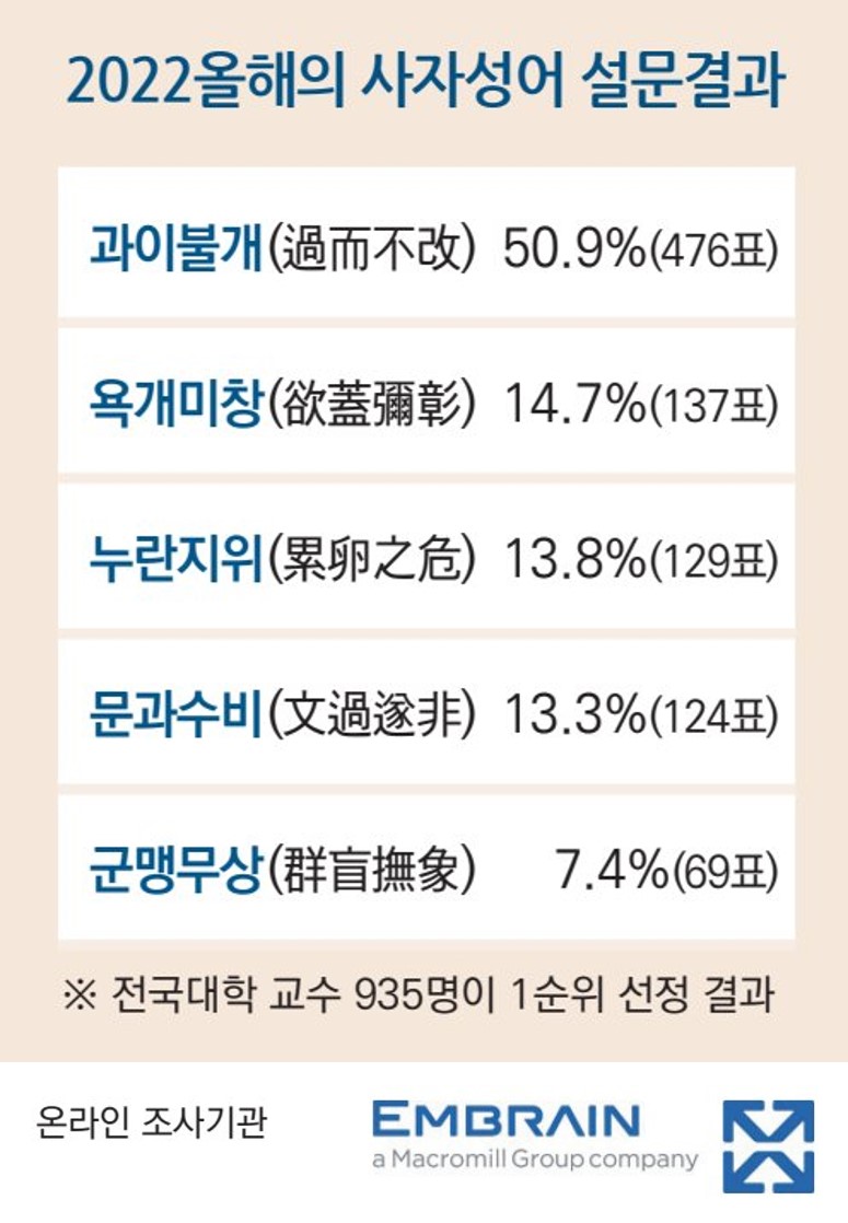 [2022 올해의 사자성어 ‘과이불개(過而不改)’ 어떻게 선정했나] 본 설문조사는 지난달 23일부터 30일까지 일주일 동안 온라인 조사 전문기업 ‘마크로밀 엠브레인’을 통해 이메일 조사 방식으