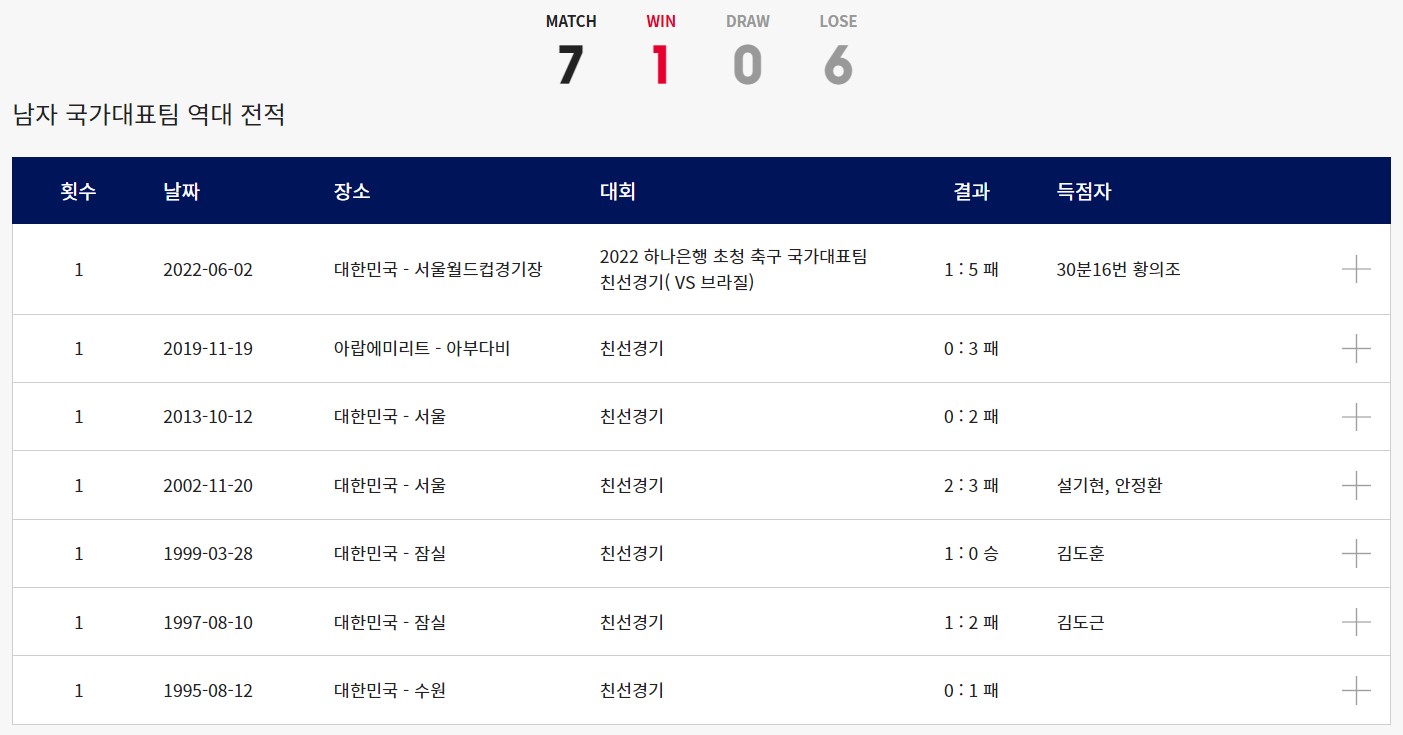 남자 국가대표 vs. 브라질 역대 전적 : 1승 0무 6패