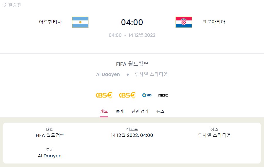 4강전 : 아르헨티나 vs. 크로아티아 (12월 14일 04시)