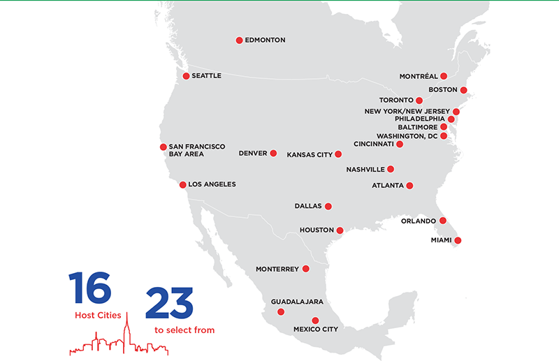FIFA는 미국 뉴욕 맨해튼에서 열린 이날 행사에서 뉴욕/뉴저지, 필라델피아, 보스턴, 마이애미, 애틀랜타, 휴스턴, 댈러스, 캔자스 시티, LA, 샌프란시스코, 시애틀을 미국의 개최 도시로 선정했습니다. 멕시코에서는 수도 멕시코시티를 비롯해 과달라하라, 몬테레이가 개최 도시로 결정됐으며 캐나다에서는 토론토와 밴쿠버가 월드컵을 개최합니다.